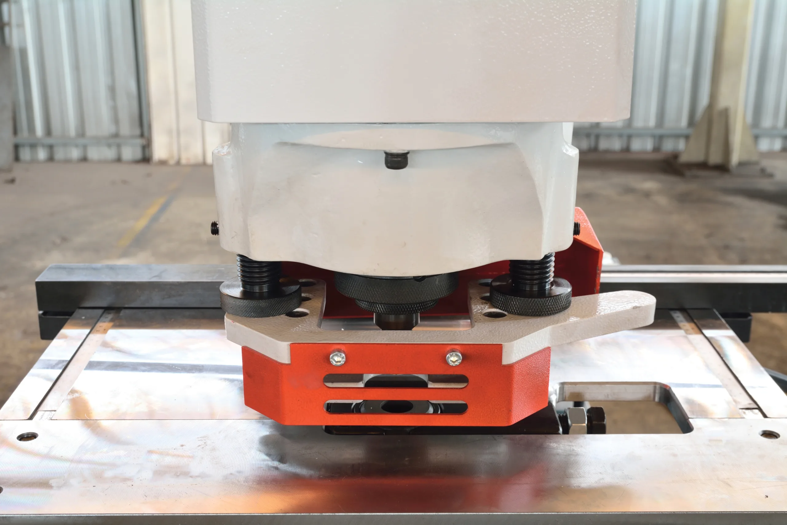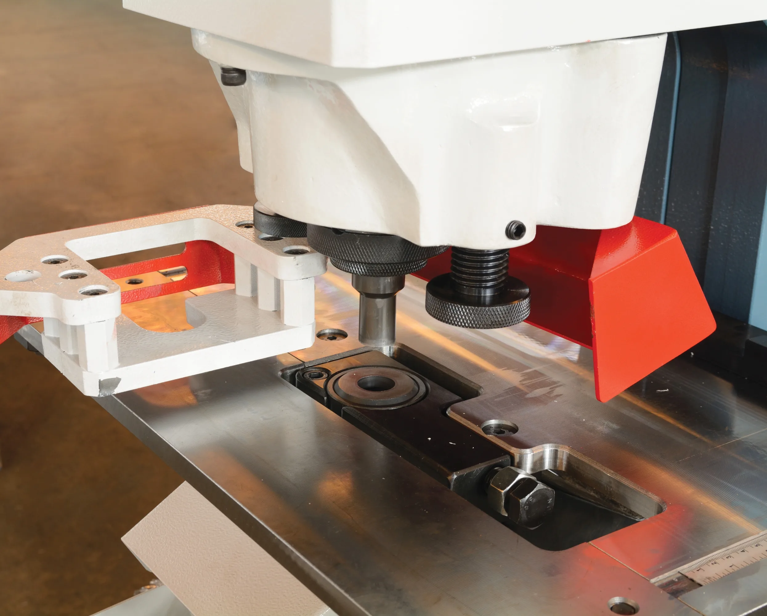 Punching station is designed versatility in mind. The station of bolster plate, makes it possible to perform a wide range of punching. This includes the punching flat bar, flange, angle and channel. The station comes standard with quick change punch and die holders, as well as a swing away stripper. Also included x & y coordinate gauge stops. This feature is useful for repetitive work. At punch station different punching diameter, pipe notching and bending with pres brake attachment can be performed.